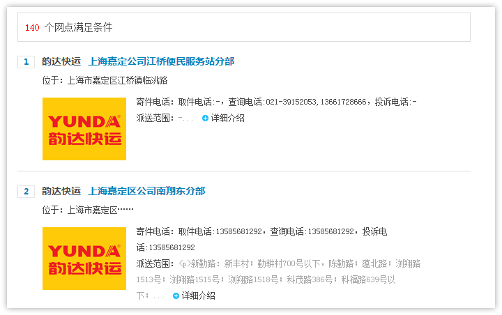 2、查詢(xún)結(jié)果頁(yè)面顯示符合條件的快遞公司網(wǎng)點(diǎn)列表,顯示快遞網(wǎng)點(diǎn)所在區(qū)域,公司地址和聯(lián)系電話(huà),如需查看更多信息,點(diǎn)擊 【查看詳情】進(jìn)入網(wǎng)點(diǎn)詳細(xì)頁(yè)面查看。